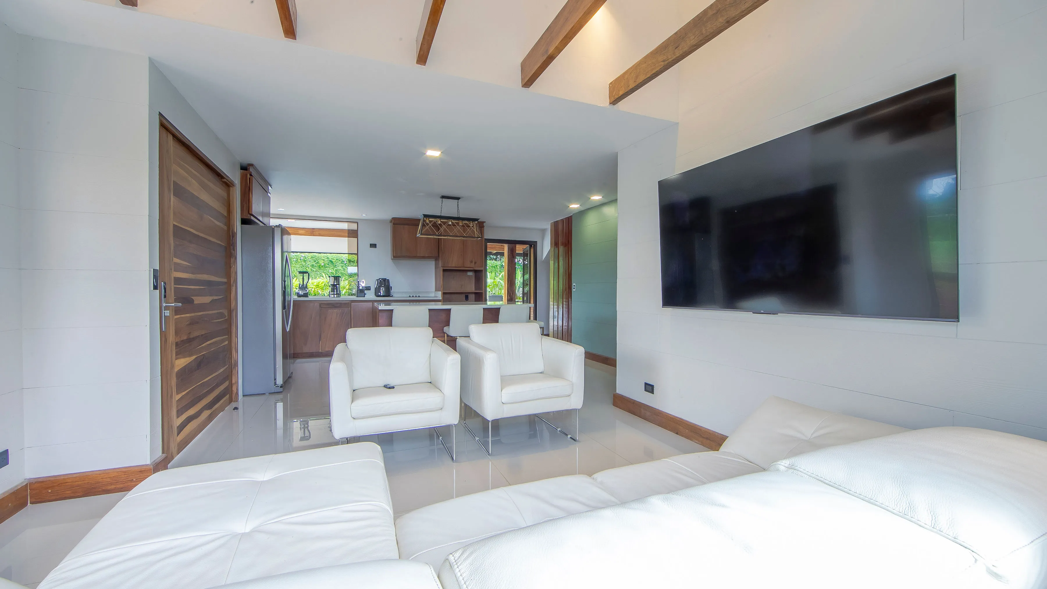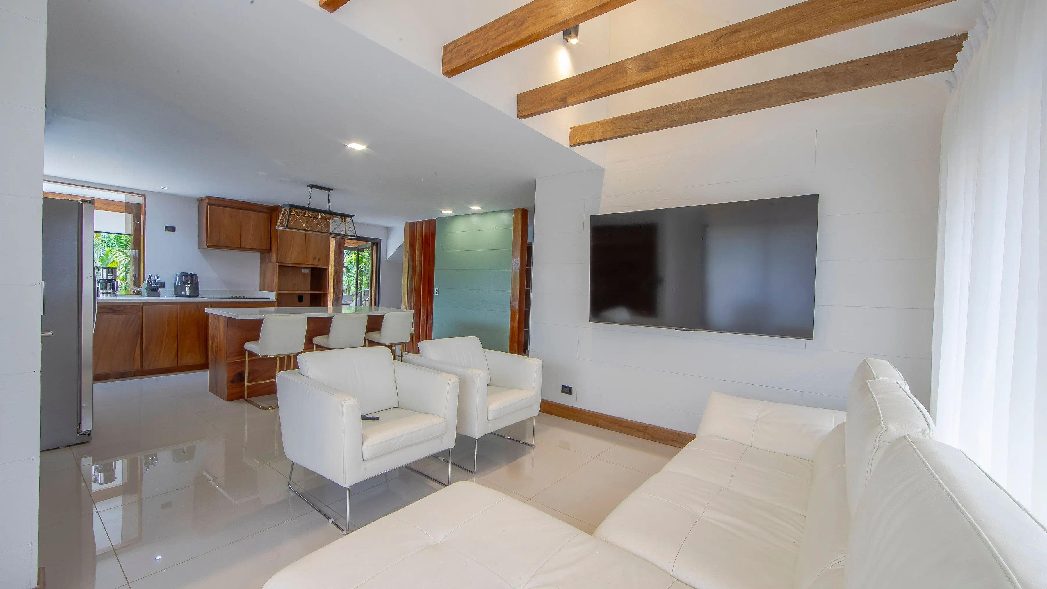 With 300 square meters of indoor space, the house comfortably accommodates up to 10 guests across four large bedrooms, each featuring its own private bathroom. Sleeping arrangements include two king-size beds and four queen-size beds.