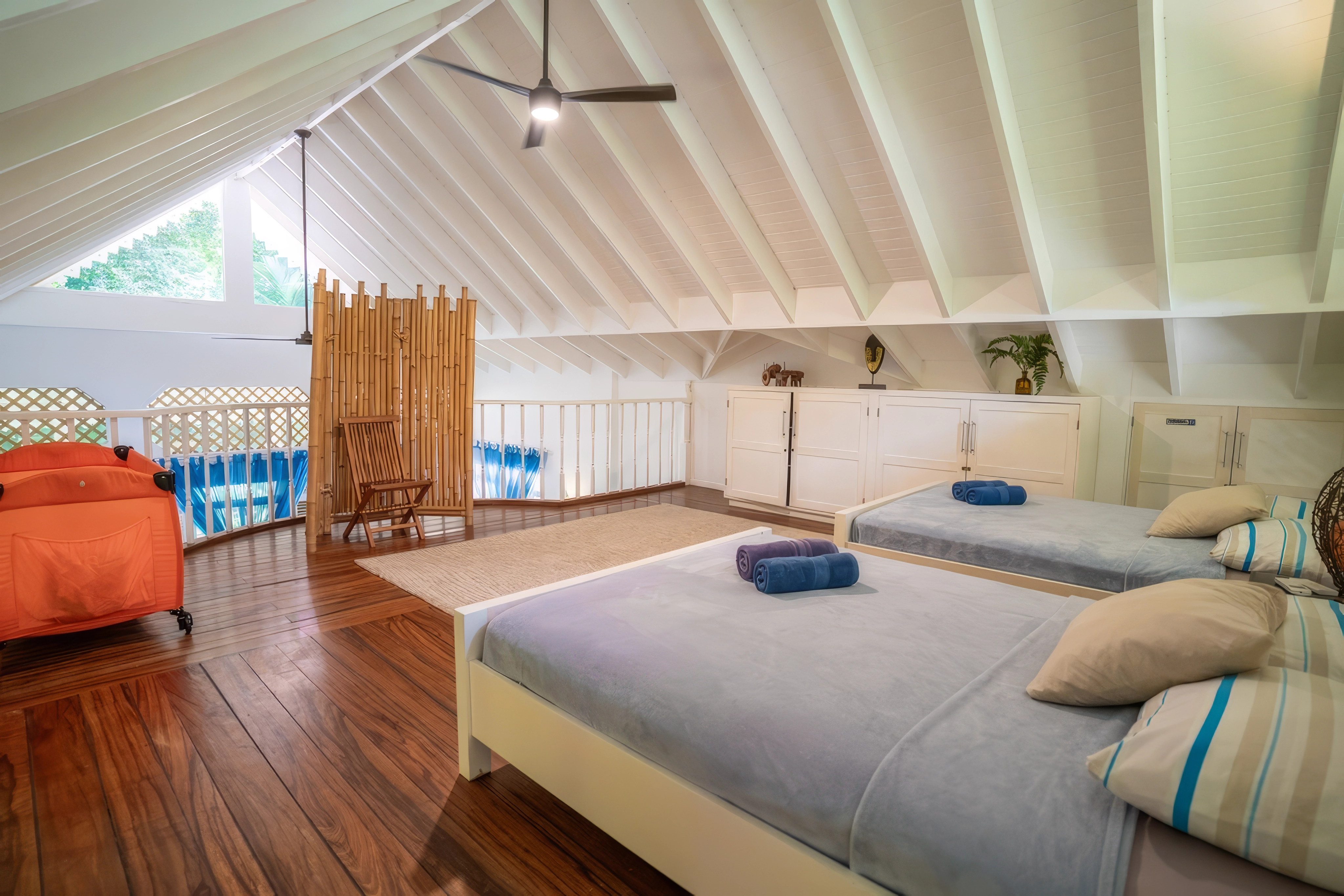 - The Suites: The Master Suite offers a King bed and sliding glass doors that open to a private canopy view of the ocean. The second "Bunk Suite" is a paradise for kids and families, featuring a queen bed and triple bunks.